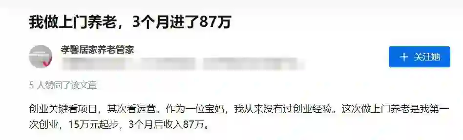各地政府也非常支持上门养老这种模式,还有人以上门养老为创业项目,3个月收入87万,可见上门服务与银发经济是非常匹配,且极具发展潜力的。