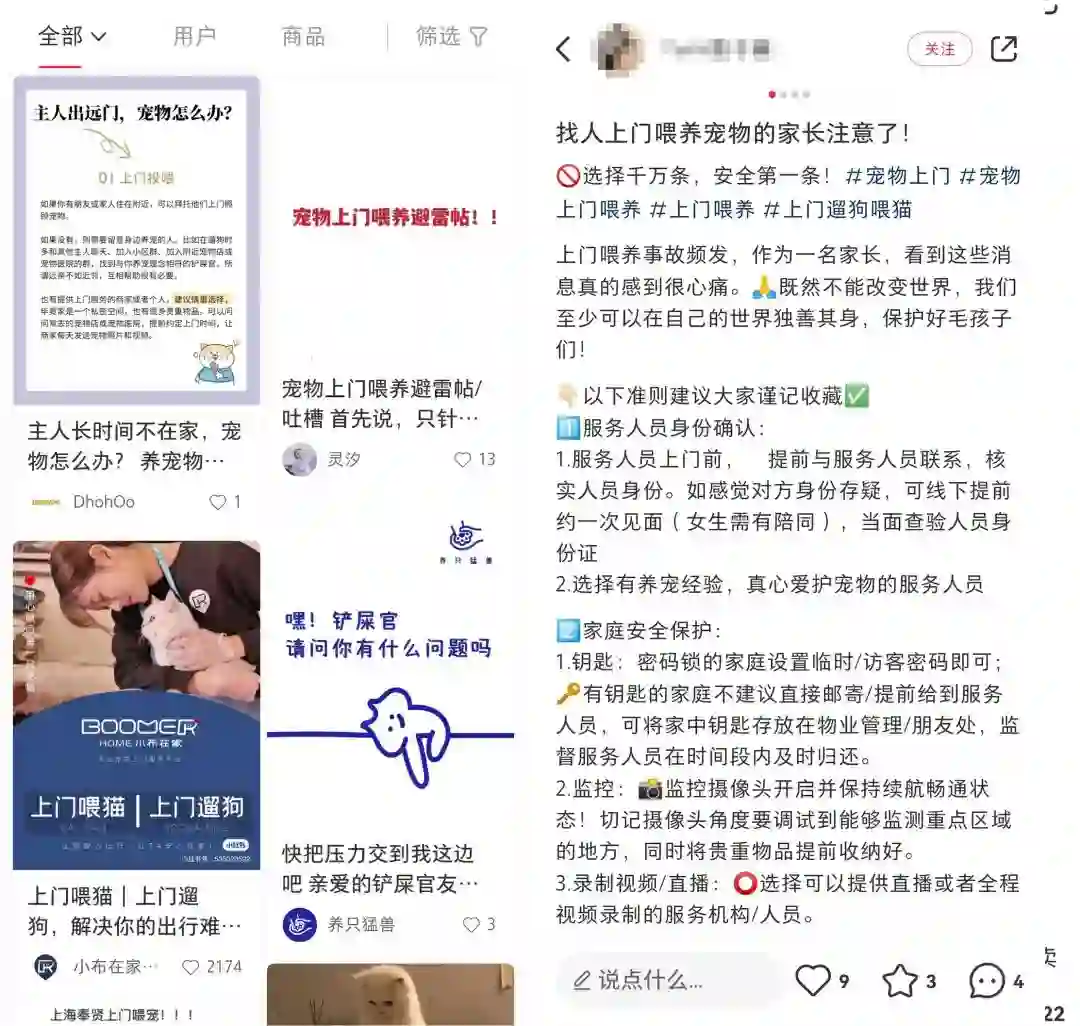 其他的上门服务也有这些问题,特别像上门喂宠这种主人基本不在场的情况,安全问题就很令人担心,小红书上搜上门喂宠除了自荐的帖子就是各种安全注意事项和避雷贴。