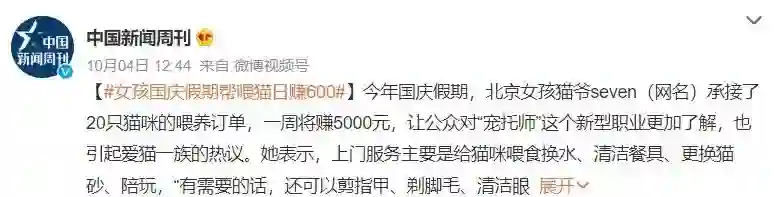 以前,人们会把宠物寄养在宠物店,但这样一来,宠物的活动范围会缩小;如今,爱宠人士有了另一个选择,那就是将宠物留在家里,请人上门喂养、陪玩。在今年国庆假期,就有人凭借上门喂宠,一周赚5000元。