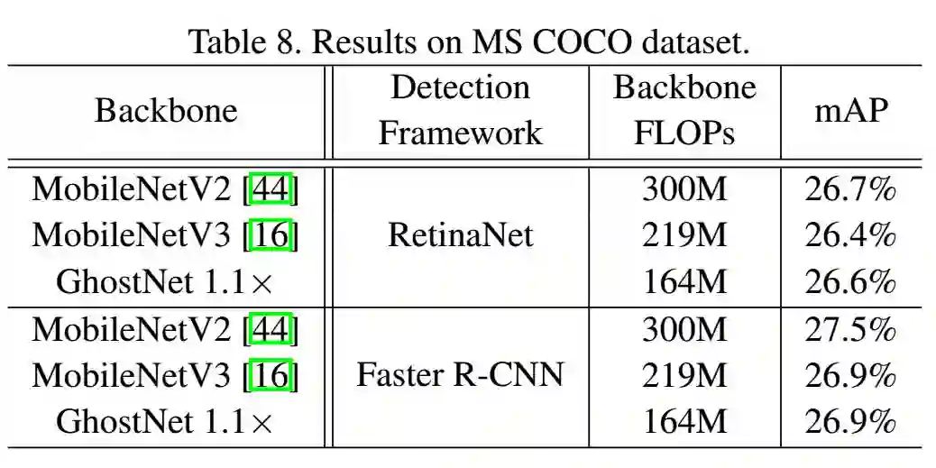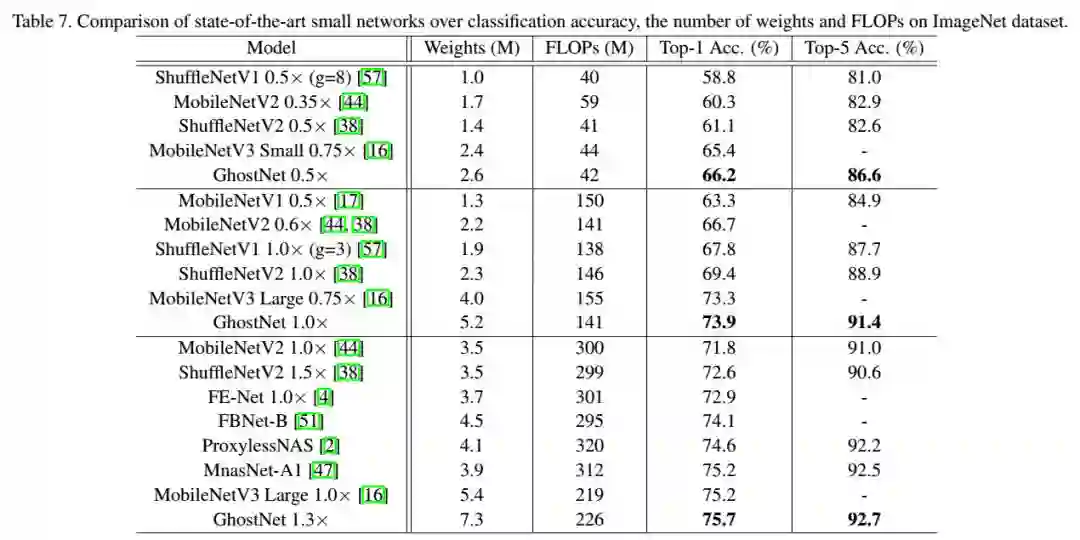 实验结果表明,所提出的Ghost模块在保持相似识别性能的同时,能够降低通用卷积层的计算成本,在移动设备上快速推理的各种任务上,Ghost网络可以超过MobileNet3等最新的高效深层模型;