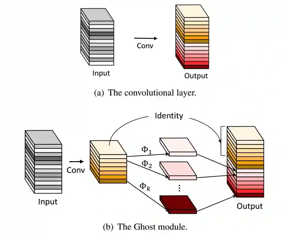 Ghost深层神经网络中的一个普通卷积层将被分成两部分。第一部分涉及普通卷积,但它们的总数将受到严格控制,给定第一部分的内在特征映射,然后应用一系列简单的线性运算来生成更多的特征映射;