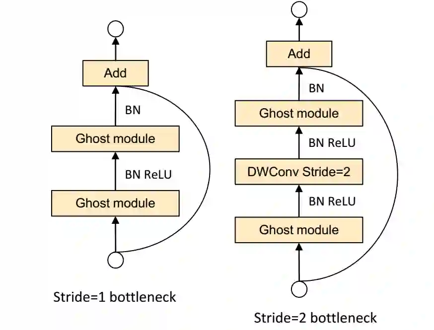 GhostNet中的主要有两类bottleneck,主要由上述Ghost module堆积,Stride分别为1和2。