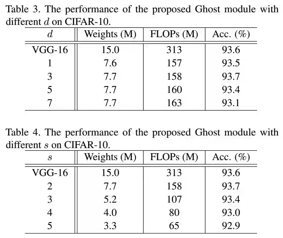 为了验证所提出的Ghost模块和GhostNet架构的有效性,我几个基准视觉数据集上进行了实验,包括CIFAR-10、ImageNet ILSVRC 2012数据集和MS-COCO对象检测基准。针对d和s的大小,论文进行了实验,最终确定了d=3,s=2。