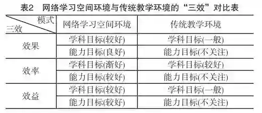 效果是对教学目标达成度的评价,是一项活动的成效与结果。就效果而言,网络学习空间环境支持下的教学在学科目标的达成上效果较好,在能力目标的达成上效果良好。而传统教学环境下的教学对学科目标的达成效果一般,基本不考虑能力目标。效率是指投入与产出的比率,人们总是希望少投入,高产出。网络学习空间环境下的教学在学科目标的达成上效率会逐渐变好,能力目标的达成上效率较好。而传统教学环境下的教学在学科目标的达成上效率较高,但基本不关注能力目标。效益是指某一特定系统运转后所产生的实际效果和利益,网络学习空间环境下的教学在学科目标和能力目标的达成上效益较好。传统教学环境下的教学在学科目标的达成上效益一般,对能力目标的关注不足。
