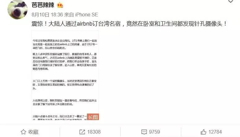 8月10日,微博ID为“芭芭辣辣”的网友在新浪微博上发出了一条名为“震惊!大陆人通过Airbnb订台湾名宿,竟然在卧室和卫生间都发现针孔摄像头! ”的长微博,其中控诉了他们在台湾地区高雄市入住Airbnb民宿被侵犯隐私的遭遇。