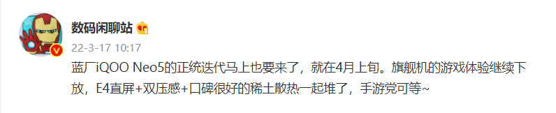 继之前有消息源曝光了 iQOO Neo 系列后续产品 iQOO Neo6 的相关信息后,日前据 @数码闲聊站 爆料称该机或将在 4 月上旬发布,并透露了其相关配置信息。根据目前曝光的信息显示,iQOO Neo6 或将采用一块 6.6 英寸的 E4 材质直屏,配备双压感肩键,主控有搭载高通骁龙 8 Gen1,同时还会沿用现款机型的稀土散热。此外在续航与快充方面也可能带来进一步的提升,其中电池容量或从 4500mAh 升至 4700mAh,快充最高功率也有望从 66W 升级为 80W。