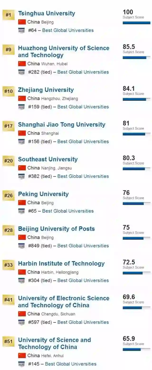 上面的这些排行主要针对各高校的综合实力排行,下面我们一起来看下各高校计算机专业方面的实力。为了尽可能的公平公正,我们特意选取了国内、国外两份榜单作比较