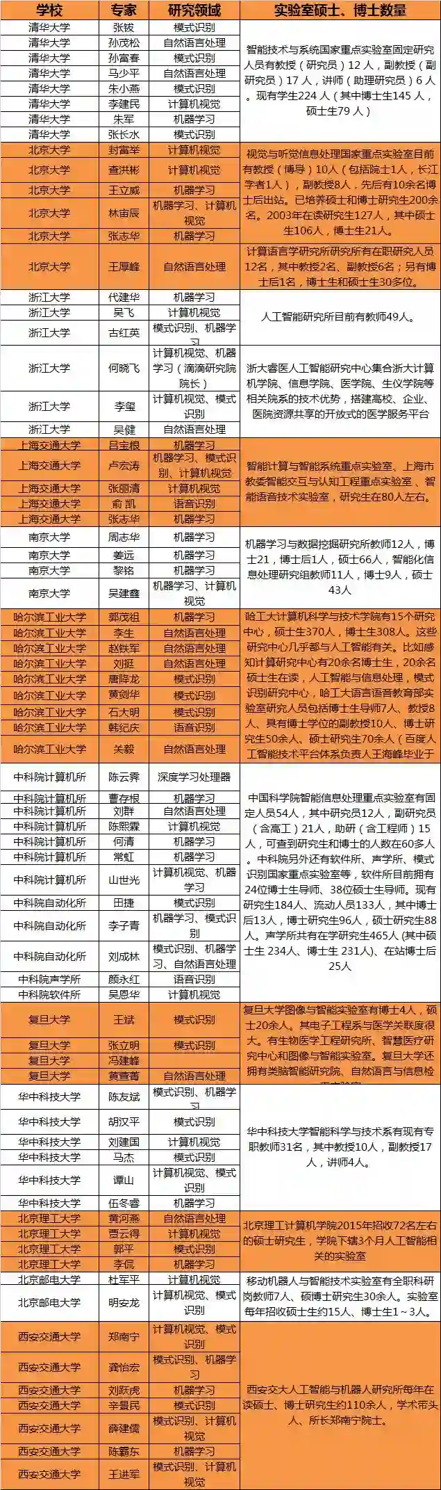 以下是动脉网整理的各高校专家的研究领域以及所在实验室的硕博人数,希望能帮助大家更直观的了解各高校的 AI 专家导师情况,
