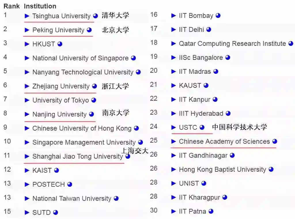 综合以上两份榜单,我们可以得出一个结论,在 AI 领域,国内的清华大学、北京大学、浙江大学、南京大学、上海交通大学、以及中国科学技术大学等实力最为突出。