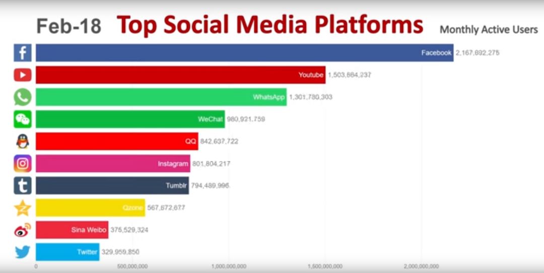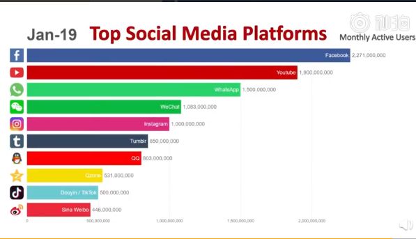 视频来自国外网友RankingtheWorld,展示了从2014年至2019年的5年里,全球社交媒体月活用户的动态变化和排名情况。(内容消费和社交的界限逐渐模糊的情况下,作者把YouTube、QQ空间和抖音均计入榜单)