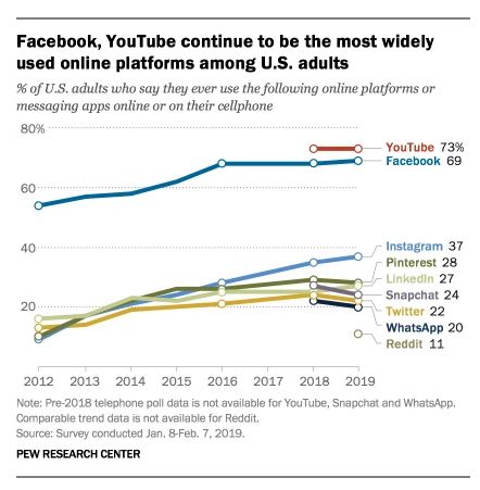 皮尤研究院针对美国成年人的社交平台使用情况调查中可以看到,整体增长出现颓势的情况下,只有Instagram出现了较大增幅,其中75%用户都是18-24岁的年轻人。