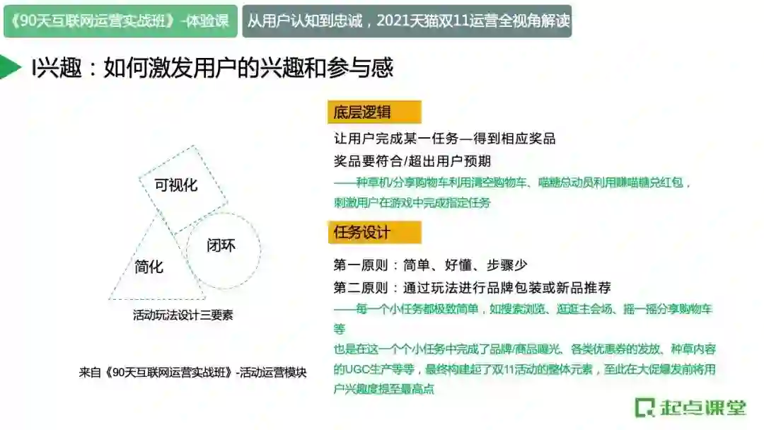 总结一下,我们在分析活动的时候,不只是看那些花里胡哨的玩法,还有它的底层逻辑是可以被复制和迁移的,都会涉及到活动玩法的三个要素:简化、可视化、闭环。