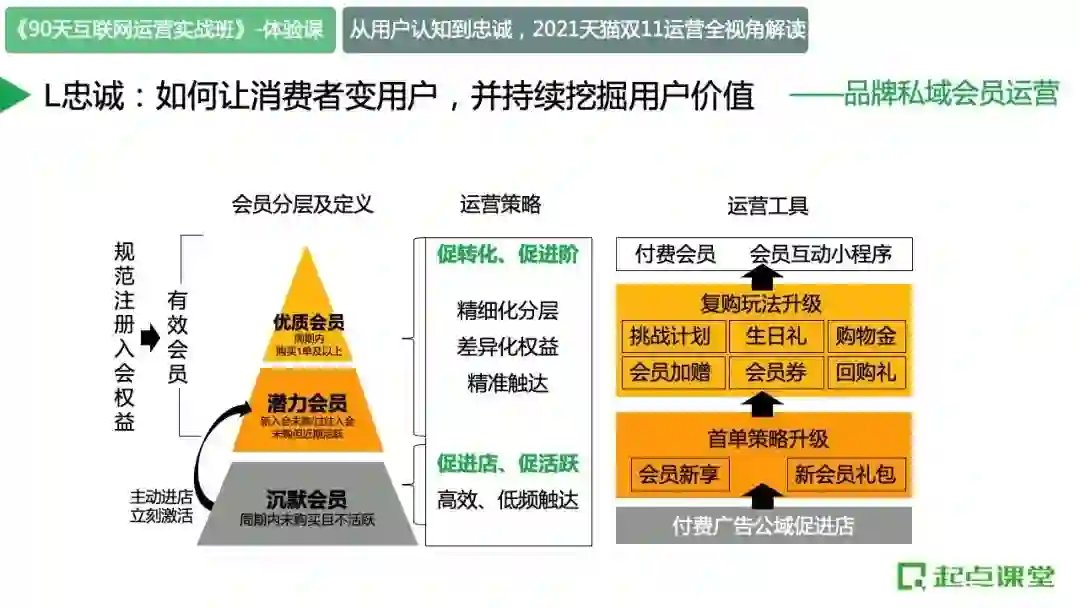 购买完以后,不代表你成为了天猫的用户。天猫需要长时间持续运营“你”,直到你会经常使用它们家的产品,你才成为了天猫的用户;否则天猫在下次做营销的时候,还是需要重新触达到你,特别难做。这就是“忠诚”。