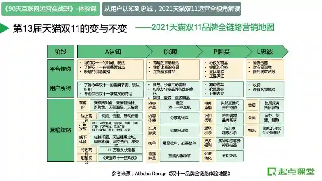 整体天猫双十一从认知-兴趣-购买-忠诚,把整个售后、物流都完全贯穿,形成了完整的全链路营销地图。