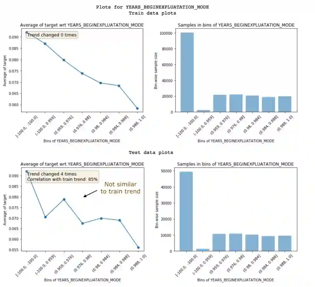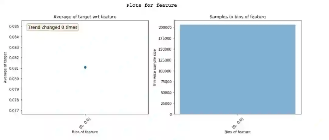 右侧 Featexp 创建了相同人数的柱状图 (x轴)。然后,它计算每个柱子中的目标均值,并将其绘制在上面左边的图中。在我们的例子中,Y坐标 target是平均的违约率。