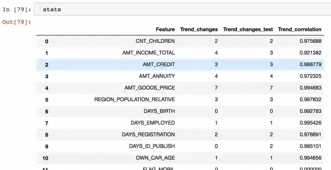 featexp中的get_trend_stats()函数会返回一个具有趋势关联和每个特性变化的dataframe。