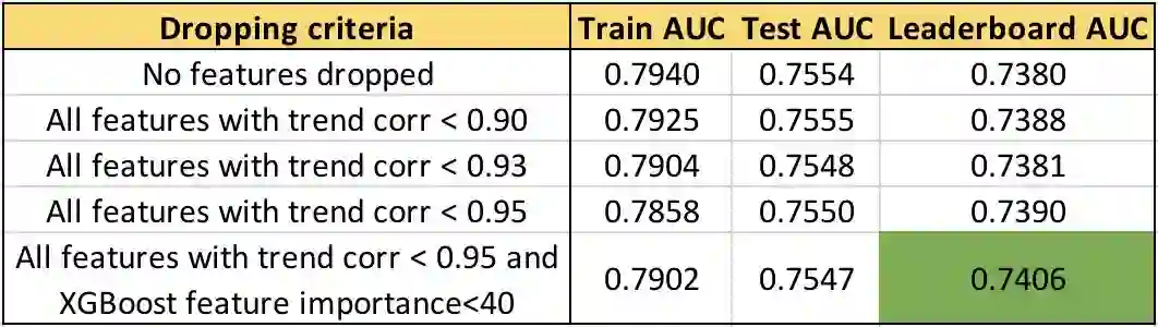 我们可以看到,特征趋势相关阈值越高,特征下降,排行榜上(LB) AUC越高。不删除重要的特性进一步将 AUC提高到0.74。有趣的是,测试AUC的变化没有 排行 AUC大。完整的代码可以在 featexp_demo 笔记本中找到。
