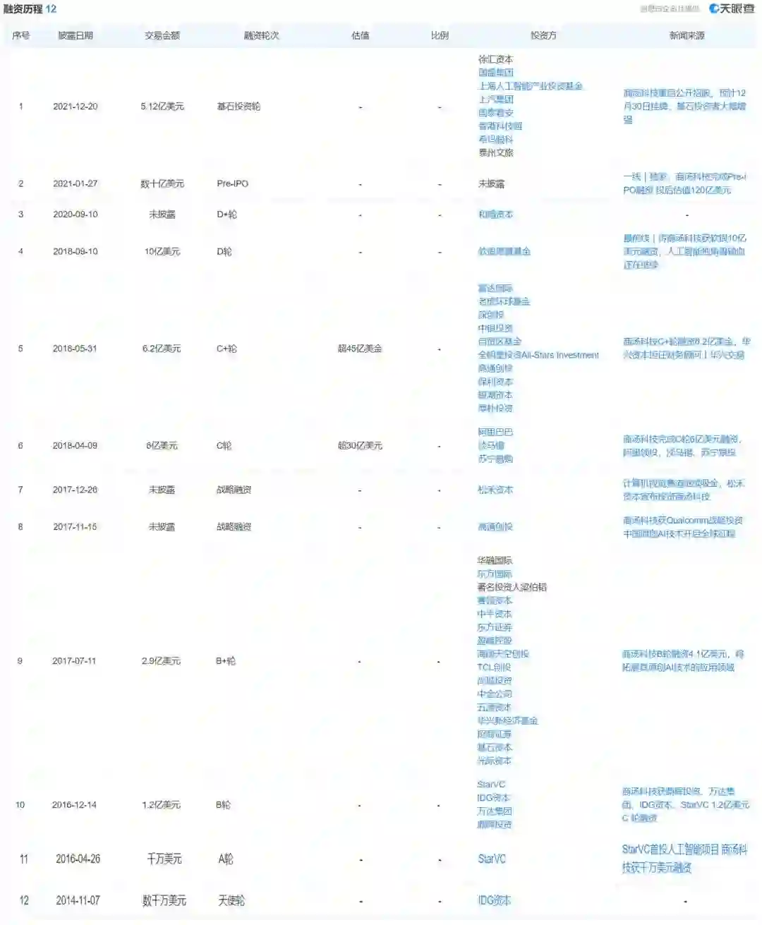 据天眼查显示,成立七年间,商汤科技完成了 12 轮融资。