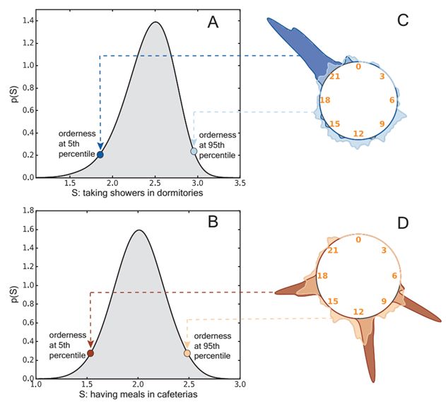 图1:洗澡和吃饭规律性示意图。(a)中深蓝色代表前5%有规律的,浅蓝色是前5%没规律的。举例而言,(c)图是开始洗澡的时间在一天24小时中的分布,大家容易看到,某位有规律的同学主要在晚上21点左右洗澡,而没有规律的某位同学除了凌晨02:30到05:30,随时都可以去洗澡。| 图片来源:Y. Cao, et al., J. R. Soc. Interface 15 (2018) 20180210
