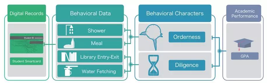 基于近两万名大学生的校园刷卡记录数据,包括食堂吃饭、寝室洗澡、教学楼打水和图书馆进出4种行为约3000万条刷卡记录,可以构建出两类高阶的行为特征(有序性和努力程度),并与学习成绩形成关联。最终,利用机器学习算法,根据学生的行为特征预测他们的学习成绩。