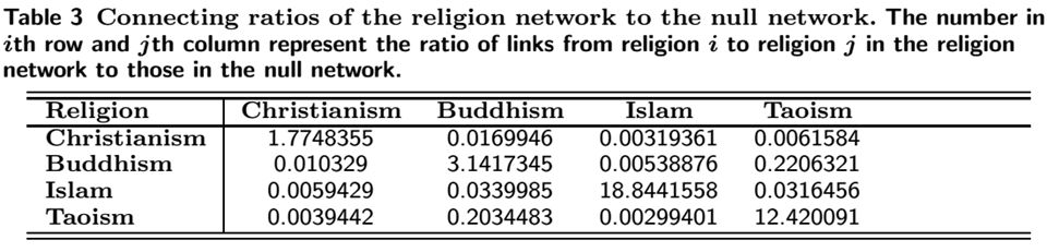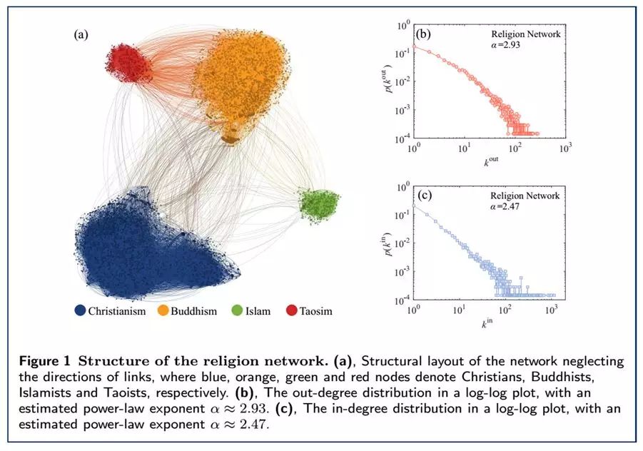 以关键词检索和人工核验的方式,研究者在新浪微博平台收集到6875个宗教信仰者账号,包含基督教、佛教、伊斯兰教和道教。分析这些宗教信仰者之间的社会网络,发现节点的出度和入度分布都有很强的异质性。而且,网络有非常清晰的社团结构,仅有1.6%的跨宗教连边。
