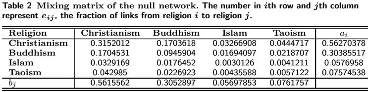 剔除掉规模效应的影响,将宗教信仰者之间连边的混合模式,与随机置乱模型下的情况做比较。结果发现,宗教信仰者仍然显著地倾向于与同宗教信仰者相连。其中,伊斯兰教和道教的同质性最为突出。佛教信仰者连接其他宗教信仰者的倾向性最大,这暗示佛教在中国的跨宗教交流中扮演重要角色。