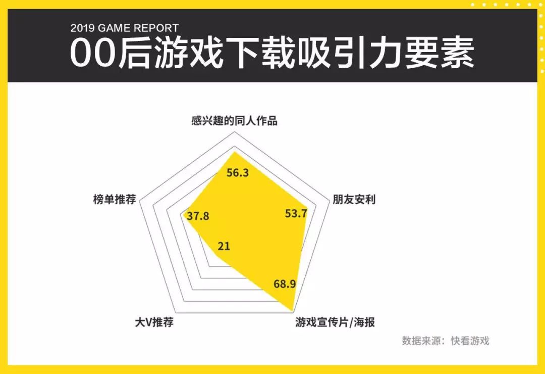 在“以下什么方式会吸引你下载一款游戏?(可多选)“问题下,68.9%的00后选择“游戏宣传片/海报吸引“,56.3%选择“感兴趣的同人作品”,“朋友安利”的影响力为53.7%,之后是榜单推荐和大v推荐,分别占比37.8%和21%。