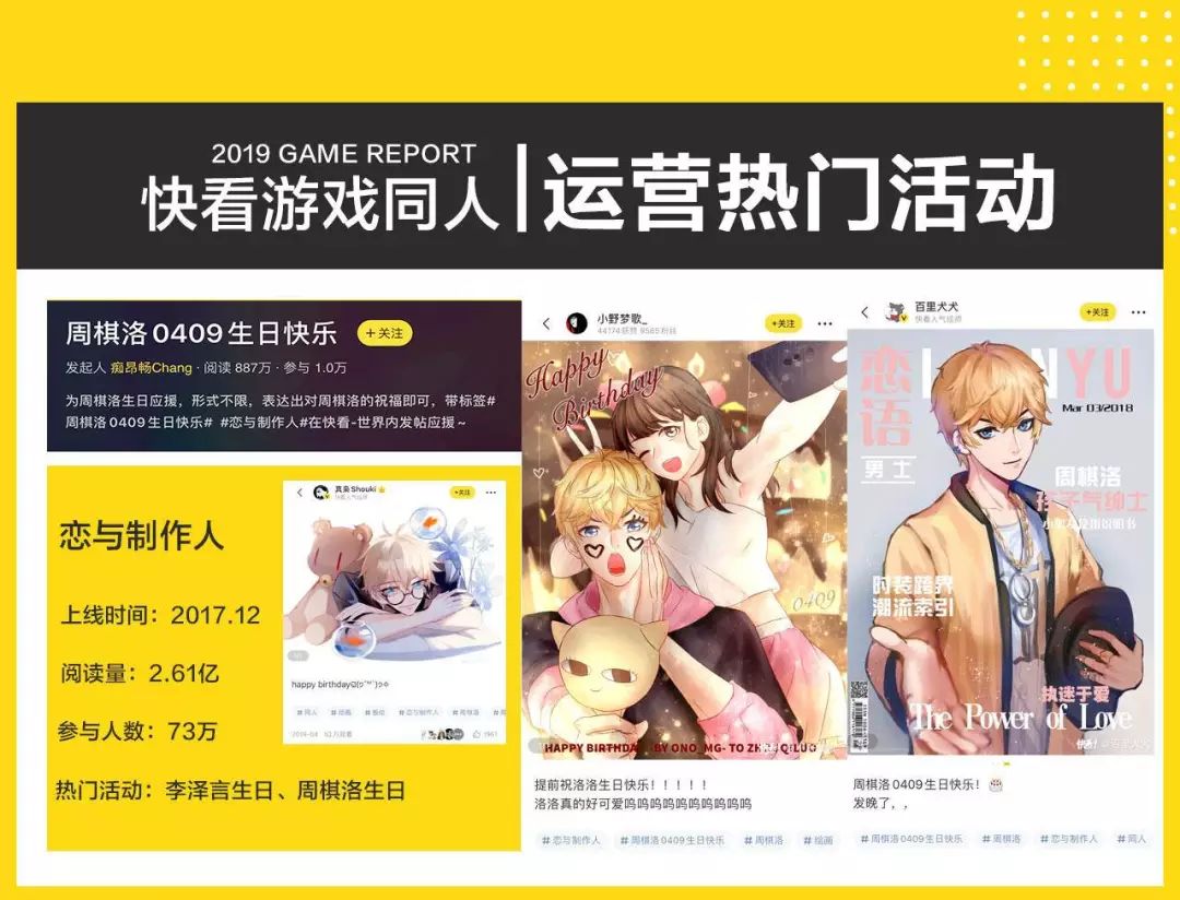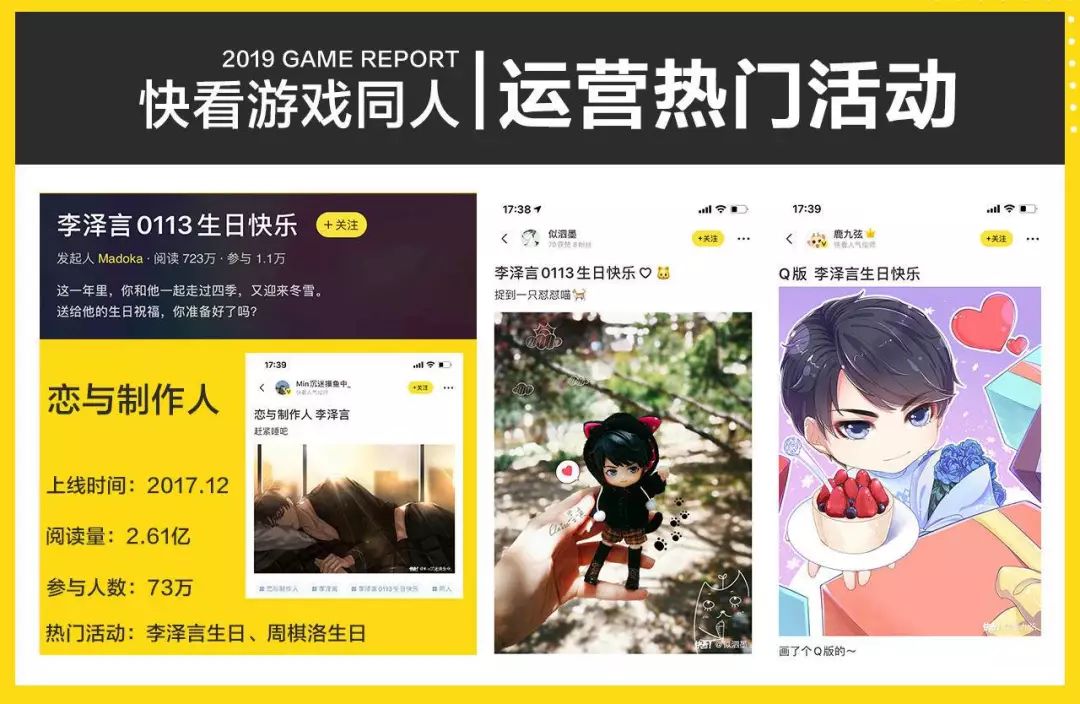 上线于2017年12月的《恋与制作人》是当年的现象级手游,直到今天,它仍保持着旺盛的生命力,在这个过程中同人运营功不可没。《恋与制作人》的同人运营大多围绕四位主角展开,借鉴了很多娱乐圈的玩法,比如为四位主角庆生已经成为每年的保留项目。目前,《恋与制作人》话题页阅读量为2.61亿。