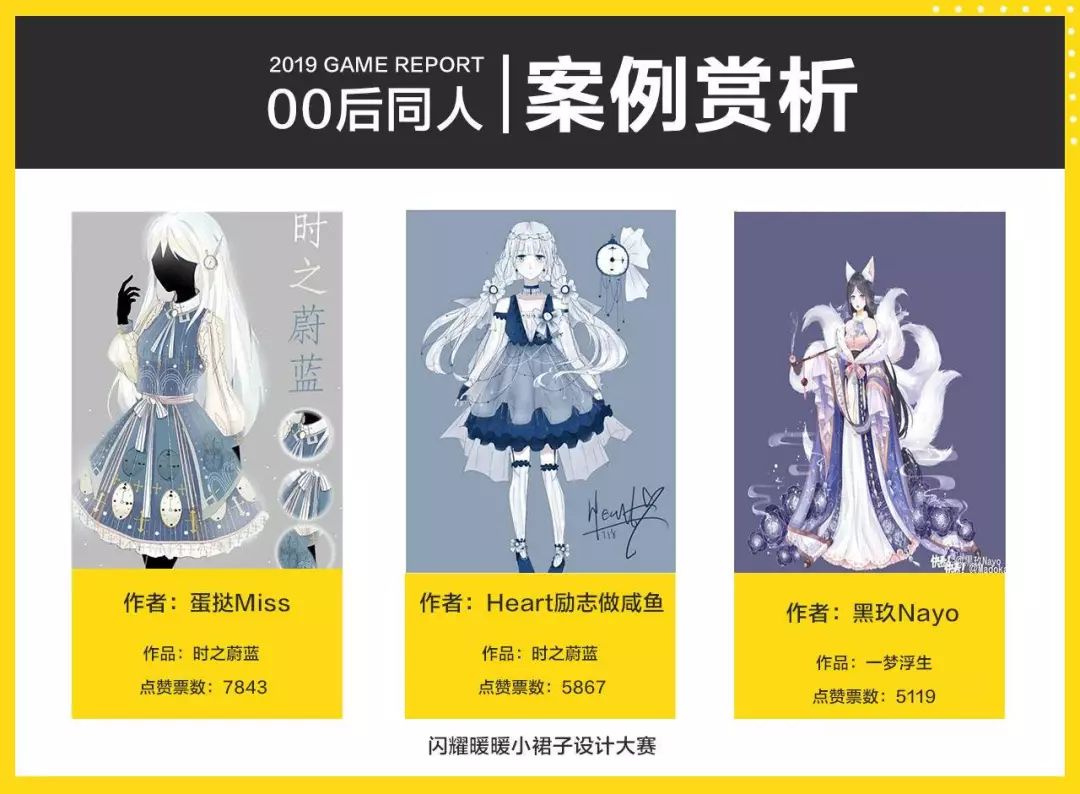“闪耀暖暖小裙子设计大赛“是手游《闪耀暖暖》与快看漫画共同举办的同人创作活动,活动规则为游戏人物设计时装。该次活动阅读量为1500万左右,吸引3.4万用户参与,下图为本次大赛设计前三名作品展示。