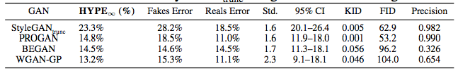 表2:在CelebA-64上训练的四个GANs上的HYPE∞。与直觉相反,真实误差随着假图像上的误差而增加,因为评价者变得更加困惑,两种分布之间的区分因素变得更加难以辨别。