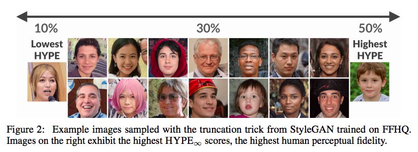 图2:使用在FFHQ上训练的StyleGAN的截断技巧采样的示例图像。右边的图像显示出最高的HYPE∞分数,最高的人类感知。