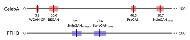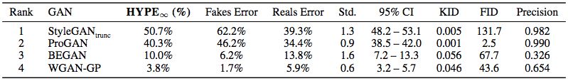 我们进行了两次大规模实验。首先,在CelebA-64,我们通过四个生成对抗网络(GANs)展示了HYPE在无条件人脸生成上的表现。我们还在FFHQ-1024上评估了的两个较新的GANs。HYPE表明,GANs之间有明显的、可测量的知觉差异;这种排名在HYPE和HYPE∞上都是相同的。表现最好的模型StyleGAN在FFHQ上接受了训练,并使用截尾技巧(截断技巧)进行了采样,HYPE∞表现27.6%,这表明改进的机会很大。我们可以以60美元的价格用30名人工评估人员用10分钟的时间重现这些结果,以95%的置信区间。