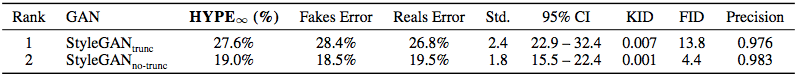 表3:FFHQ-1024培训的StyleGANtrunc和StyleGANno-trunc上的HYPE∞。评价者经常被StyleGANtrunc欺骗。