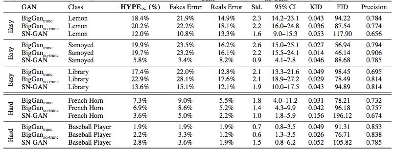 表4:在ImageNet上训练的三个模型上的HYPE∞和在五种类别里有条件抽样。BigGAN的表现通常优于SN-GAN。BigGANtrunc和BigGANno-trunc不可分离。
