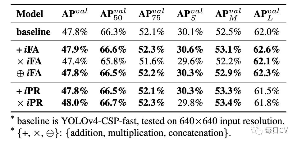 基于上面的分析,作者设计了另外两个实验。在第一个实验中,作者通过锚框聚类来划分特征空间,并执行相乘细化,第二个实验中,作者只在width和height上执行相乘细化。结果如表5所示,发现经过相应的修改,各项指标都得到了提高。实验表明,在设计显式知识与隐式知识的结合时,首先要考虑结合层的物理意义,以达到更好的效果。