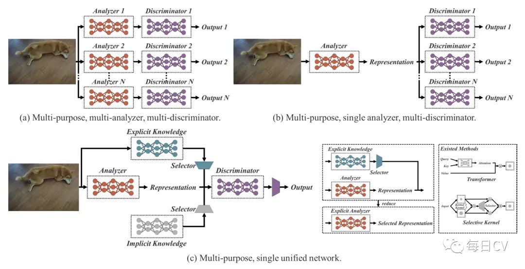 如图1所示,人可以从多个角度来分析同一个目标,然而通常训练CNN时只给予了一个角度,也就是说针对某一个任务得到的CNN特征很难适用于其他问题。作者认为造成上述问题的原因主要是模型只提取了神经元特征而丢弃了隐式知识的学习运用,然而就像人脑一样隐式知识对分析各种各样的任务是非常有用的。