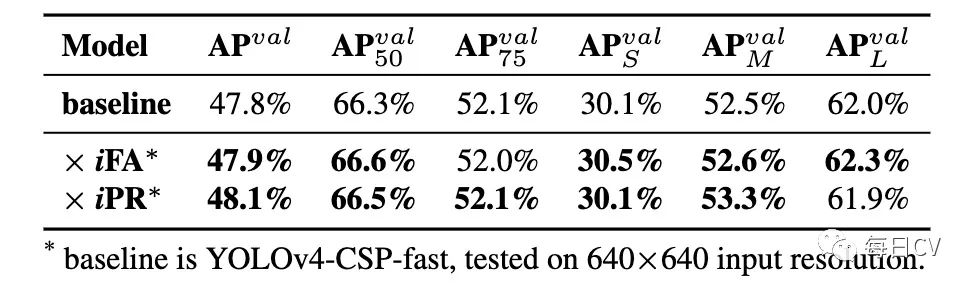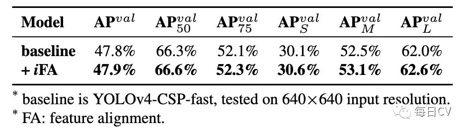 使用简单的向量隐式表征和加法算子,在FPN的每一个特征映射层添加隐式知识进行特征对齐,各个指标获得到了有意义的提升,如表1所示。