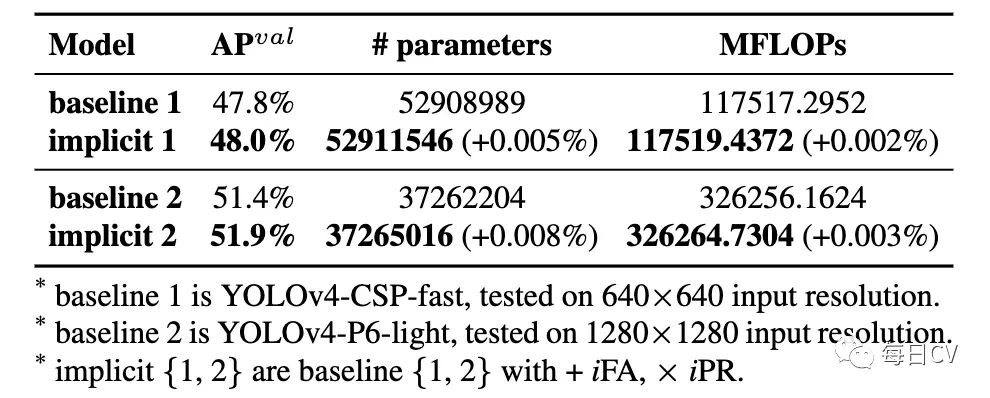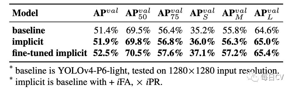使用简单的向量隐式表征和加法算子,在YOLO的每一个输出层添加隐式知识进行预测细化,大部分指标都获得到了一定的增益,如表2所示。