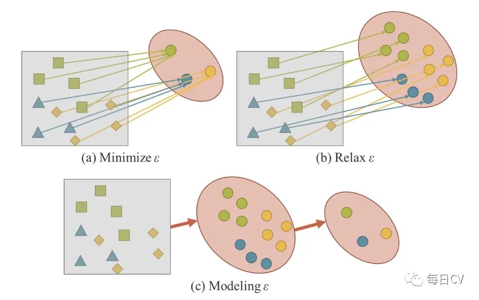 训练过程中最小化 , 这表示我们期望同一目标的不同观测值是 所得到的子空间中的一个 点, 如图6 (a) 所示。换言之, 我们期望得到的解空间只对当前任务 有区别, 对各种潜在 任务中除 以外的任务是不变的, 其中 。(解释: 以图6 (a) 为例, 不同颜色的圆形解空间只对不同颜色的形状任务 有变化, 比如绿色方形对应绿色圆形, 而 蓝色三角形对应结果就变化成了蓝色圆形,但是对绿色方形类内的不同观测值(潜在任务), 如位置的变化, 其对应的解空间是不变的。)