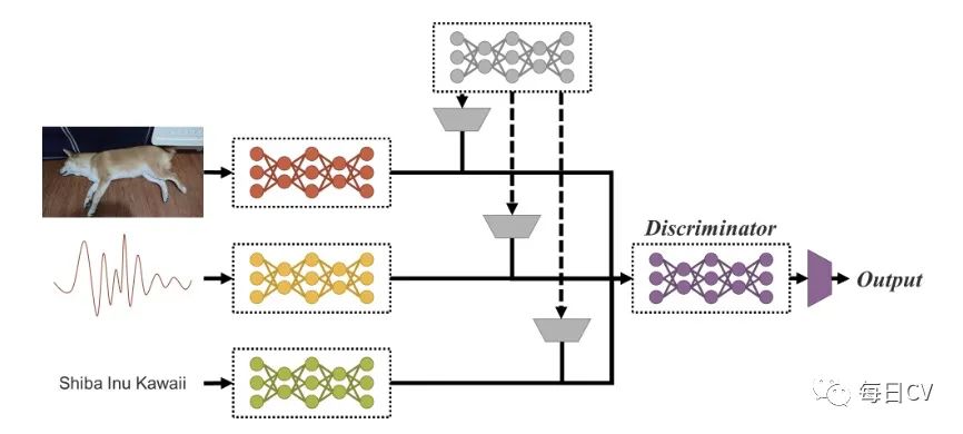 对于所有任务, 以一个共同统一的表征 开始, 然后进入基于任务而不同的隐式表征 , 最后用任务特定的判别器 完成不同的任务。
