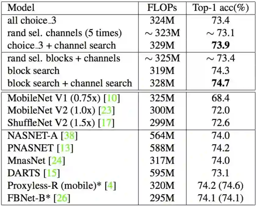 对比实验证明了这一方法的灵活性和有效性,不仅易于训练和快速搜索,并且可以轻松支持不同的复杂搜索空间(比如构造单元,通道数,混合精度量化)和搜索约束(比如 FLOPs,速度),从而便于满足多种需求。这一方法在大型数据集 ImageNet 上取得了当前最优结果。