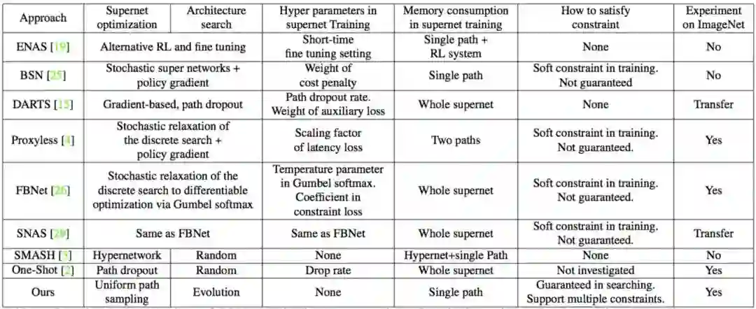 单路径超网络、均匀采样训练策略、基于进化算法的模型搜索、丰富的搜索空间设计,上述多种设计使得本文方法简单、高效和灵活。表 1 给出了本文方法与其他权重共享方法的一个全方位、多维度对比结果。
