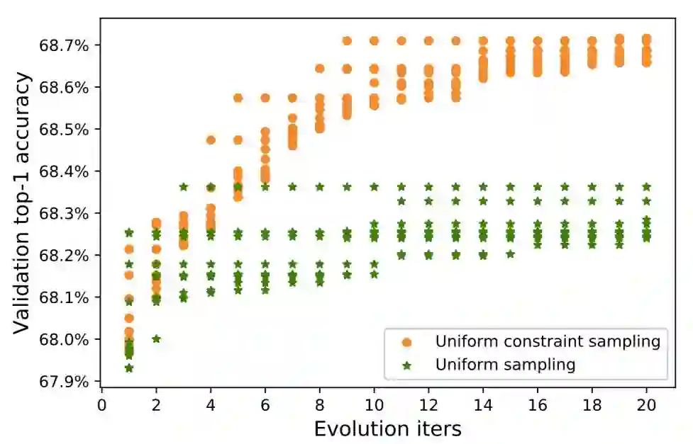 通过借助进化算法,搜索同样非常灵活。像等式 (3)对模型结构进行的约束可以精确地满足。并且一旦训练好一个超网络,可在同一超网络内基于不同约束(比如 100ms 和 200ms 延迟)重复搜索。这些特性是先前方法所缺失的,将使 One-Shot NAS 方法对实际任务更具吸引力。