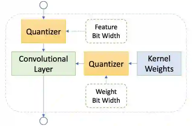 混合精度量化搜索。选择单元可以搜索卷积层权重和特征的量化精度。在超网络训练中,特征图的位宽和和权重被随机选取。详见图 5。