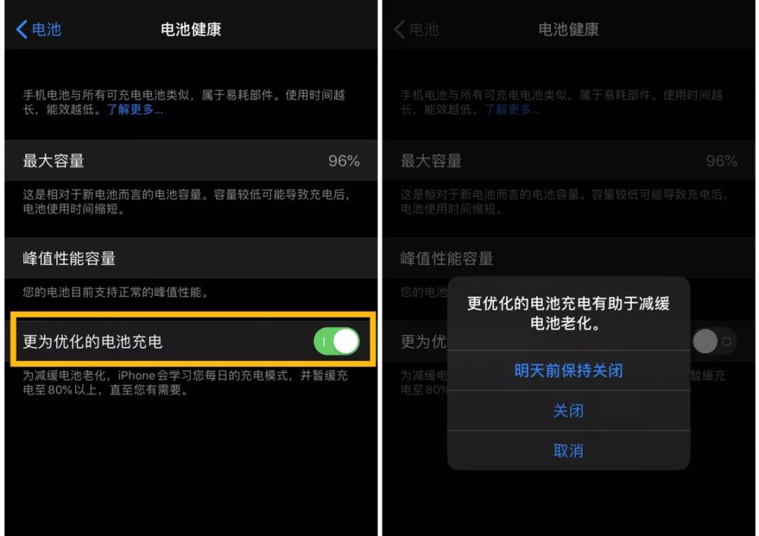 加入了优化电池充电功能,学习你的充电习惯,以提高电池寿命。