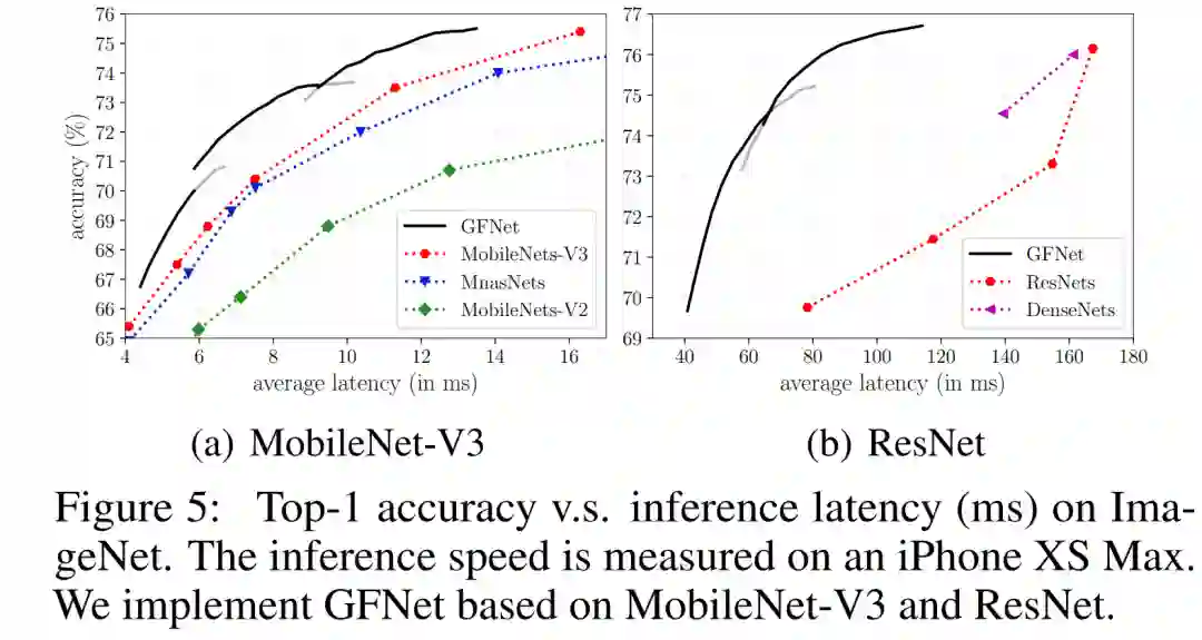 图9 GFNet在一台iPhone XS Max上的实际测试结果(Accuracy v.s. Latency)