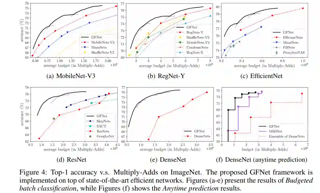 下图为我们在不同网络结构上实现GFNet的实验结果,其中横轴为网络的平均理论计算开销,纵轴为准确率,(a-e)为budgeted batch classification的结果,(f)为anytime prediction的结果。