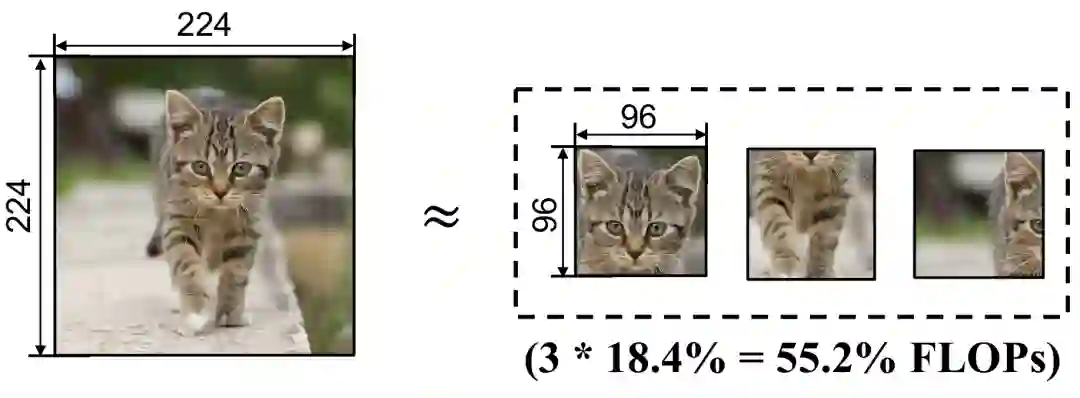 以下面的示意图为例,将一张224x224的图片分解为3个96x96的Patch进行处理所需的计算量仅为原图的55.2%。