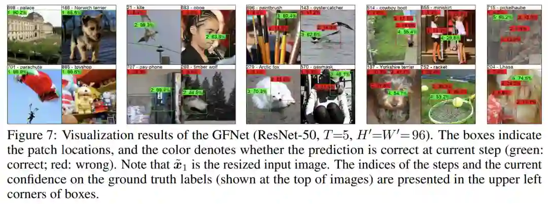 下面是GFNet的一些可视化结果,可以从中看出,对于比较简单的样本,GFNet可以仅在Glance阶段或Focus阶段的第一步以很高的confidence得到正确的结果,对于较为复杂的样本,则实现了以不断关注关键区域的形式逐步提升confidence。