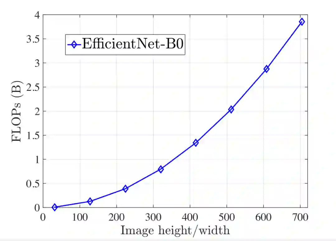 然而,这种方式会带来较大的计算开销,因为推理CNN所需的计算量(FLOPs)基本与像素数目成正比,即与图形的长、宽成二次关系,如下图所示:
